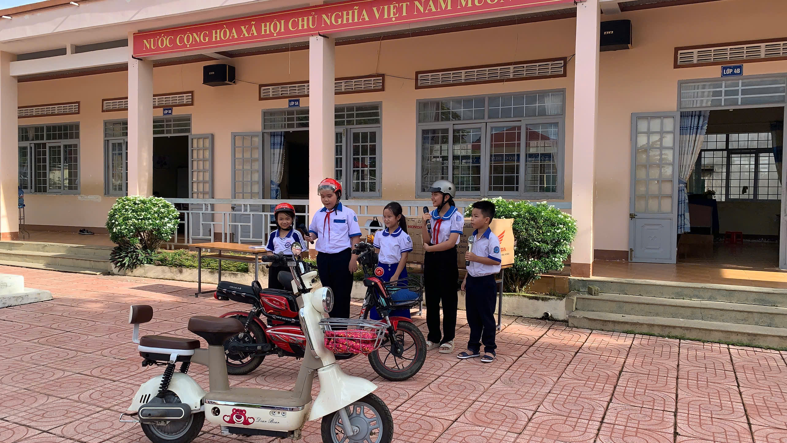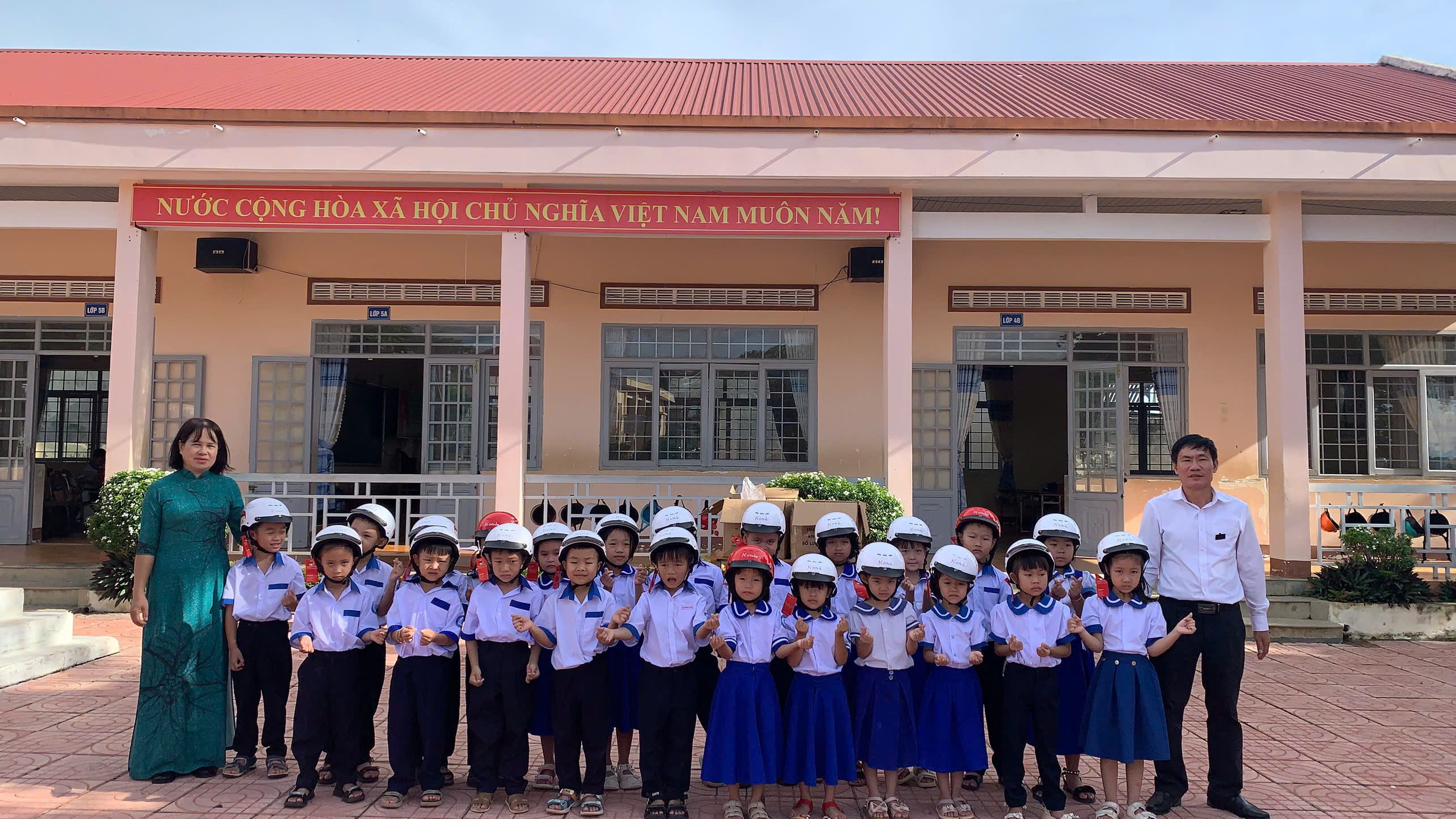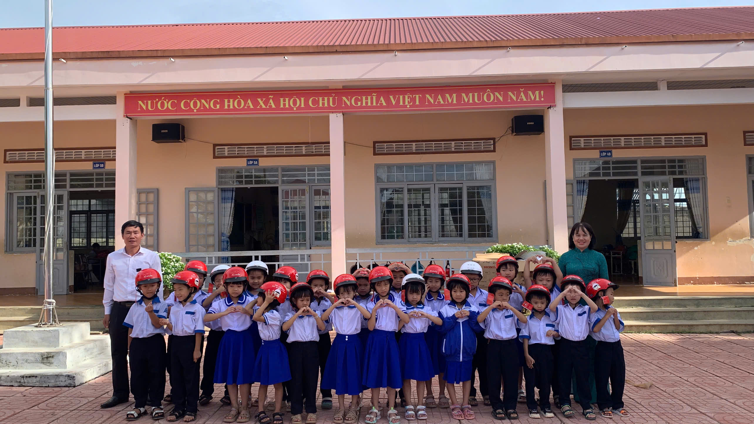 Nhà trường cũng đã trao tặng 47 mũ bảo hiểm cho các em học sinh lớp 1 của trường do hãng Hon Đa Trung Thạch tài trợ.