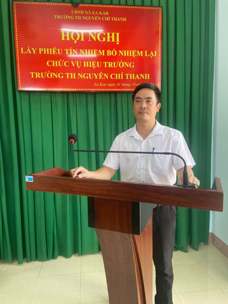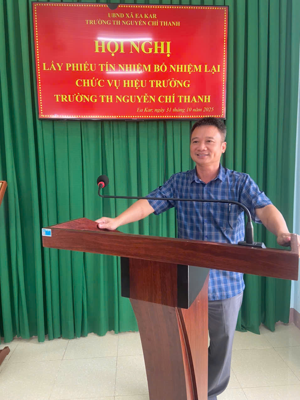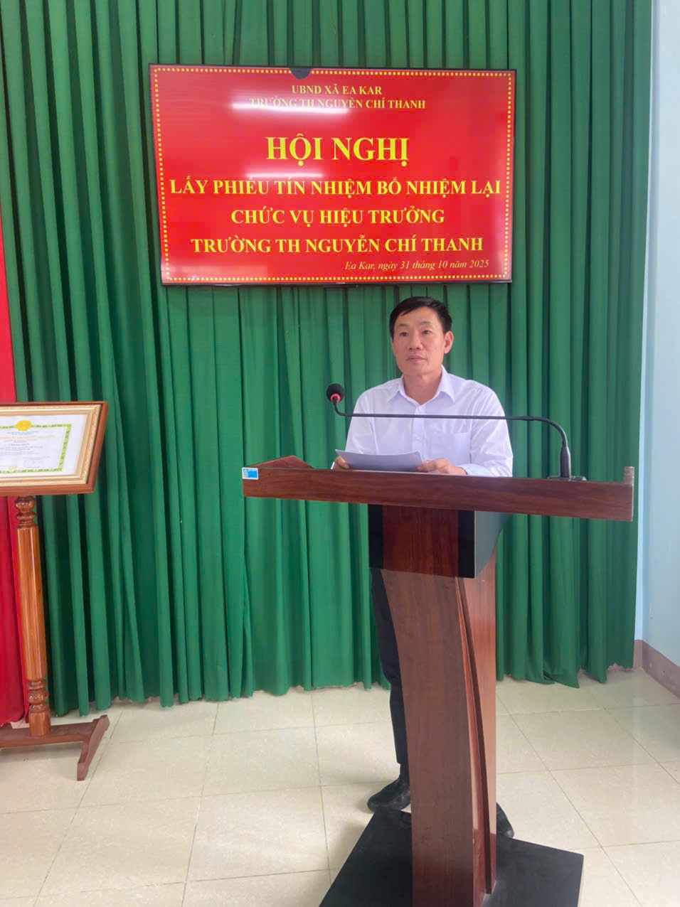 Sáng ngày 31/10/2025 tại phòng hội đồng trường Tiểu học Nguyễn Chí Thanh tổ chức Hội nghị lấy phiếu tín nhiệm bổ nhiệm lại chức danh Hiệu trưởng, trường Tiểu học Nguyễn Chí Thanh. Về dự hội nghị có các đ/c lãnh đạo,Ông Bùi Duy Hải Phó trưởng ban xây dựng công tác Đảng, Ông Phạm Đức Tân và Bà Trần Thị Lệ Hằng chuyên viên Phòng Văn hoá – Xã hội xã Eakar.