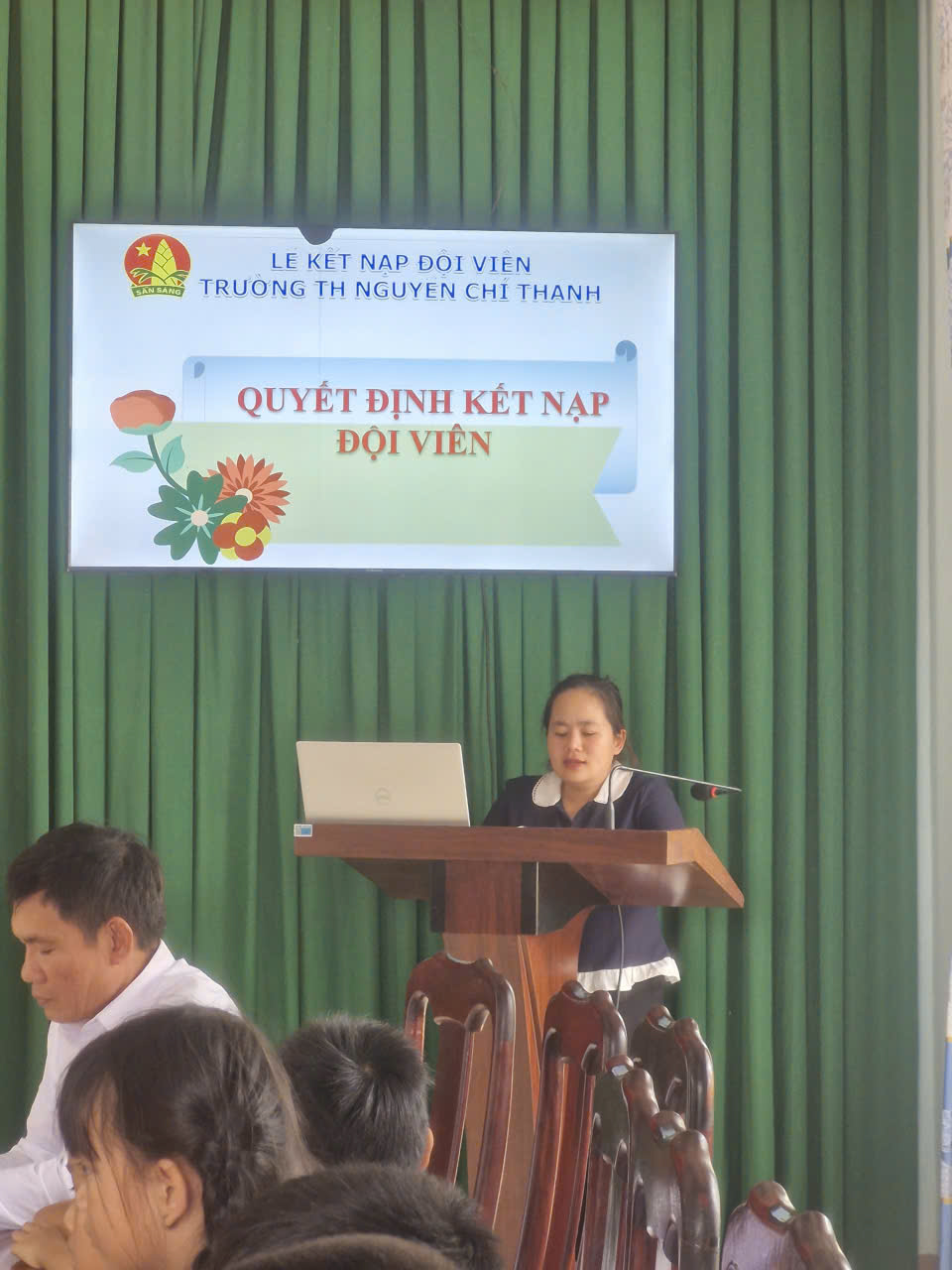 Tiếp theo chương trình Cô Bùi Thị Mai Huê – Fiaó viên tơngr phụ trách đội đọc Quyết định chuẩn y kết nạp Đội viên Đội TNTP Hồ Chí Minh và căn dặn Đội viên mới “Kể từ ngày hôm nay, các em đã chính thức được đứng trong hàng ngũ Đội TNTP HCM, hy vọng rằng các em sẽ luôn luôn cố gắng học tập, rèn luyện nhiều hơn nữa để trở thành Đội viên tốt”.